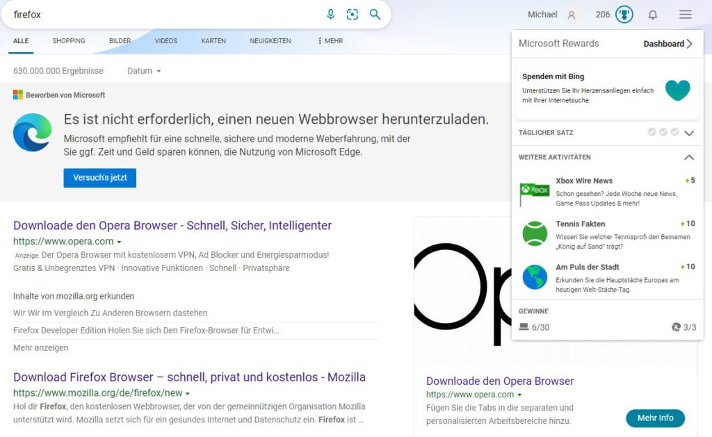 Microsoft wirkt sehr verzweifelt, wenn es darum geht, die eigenen Produkte zu bewerben oder Kunden von der Konkurrenz fernzuhalten. Die Suche mit Microsofts Suchmaschine Bing wird nicht nur mit Microsoft Rewards belohnt, sondern Bing weist auch darauf hin, dass Microsoft mittlerweile einen modernen Browser (auf Chromium-Basis) hat: